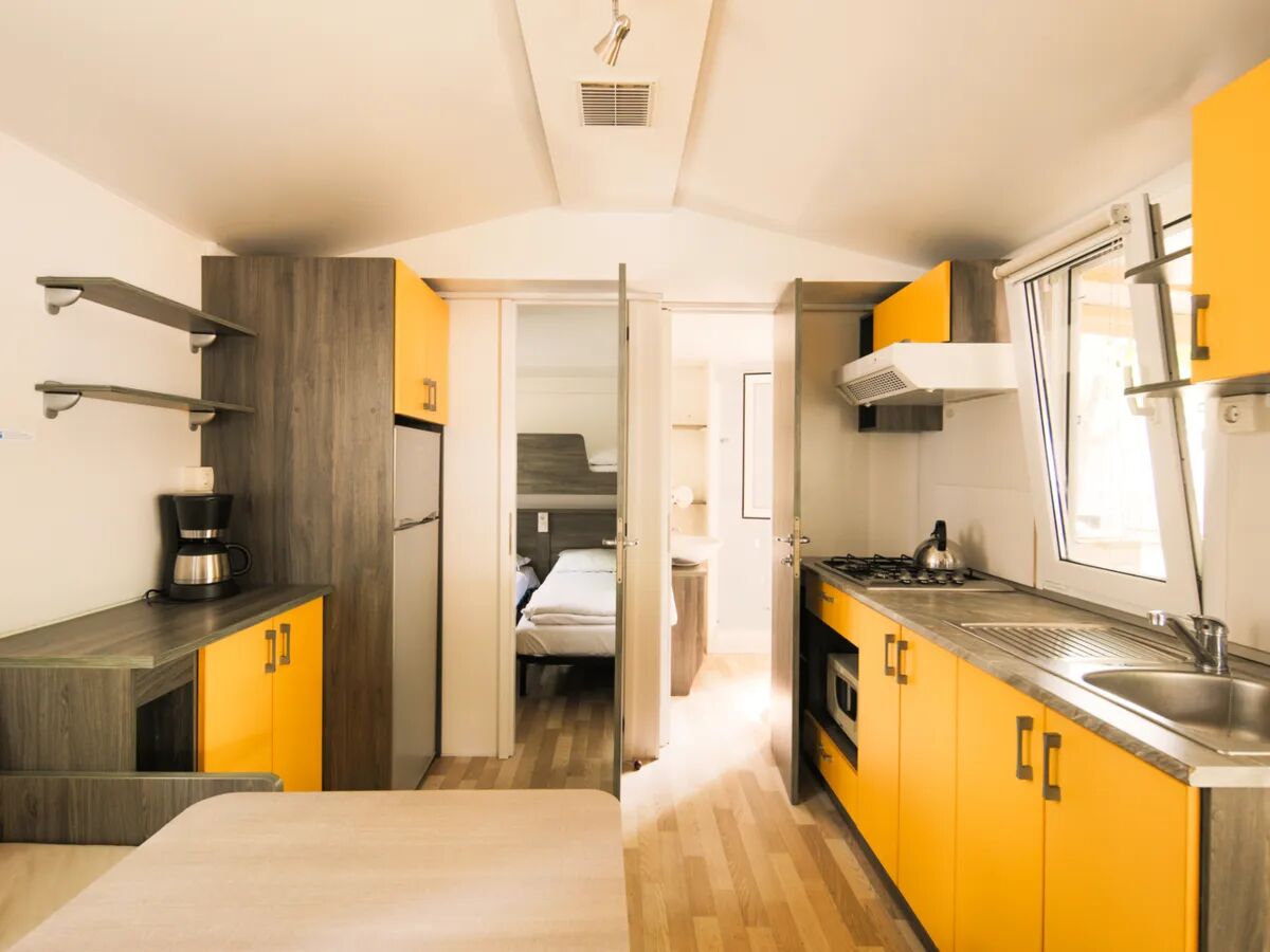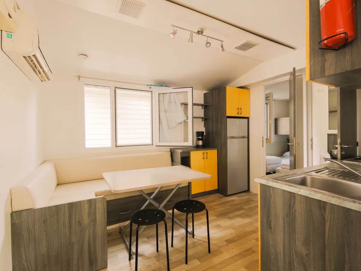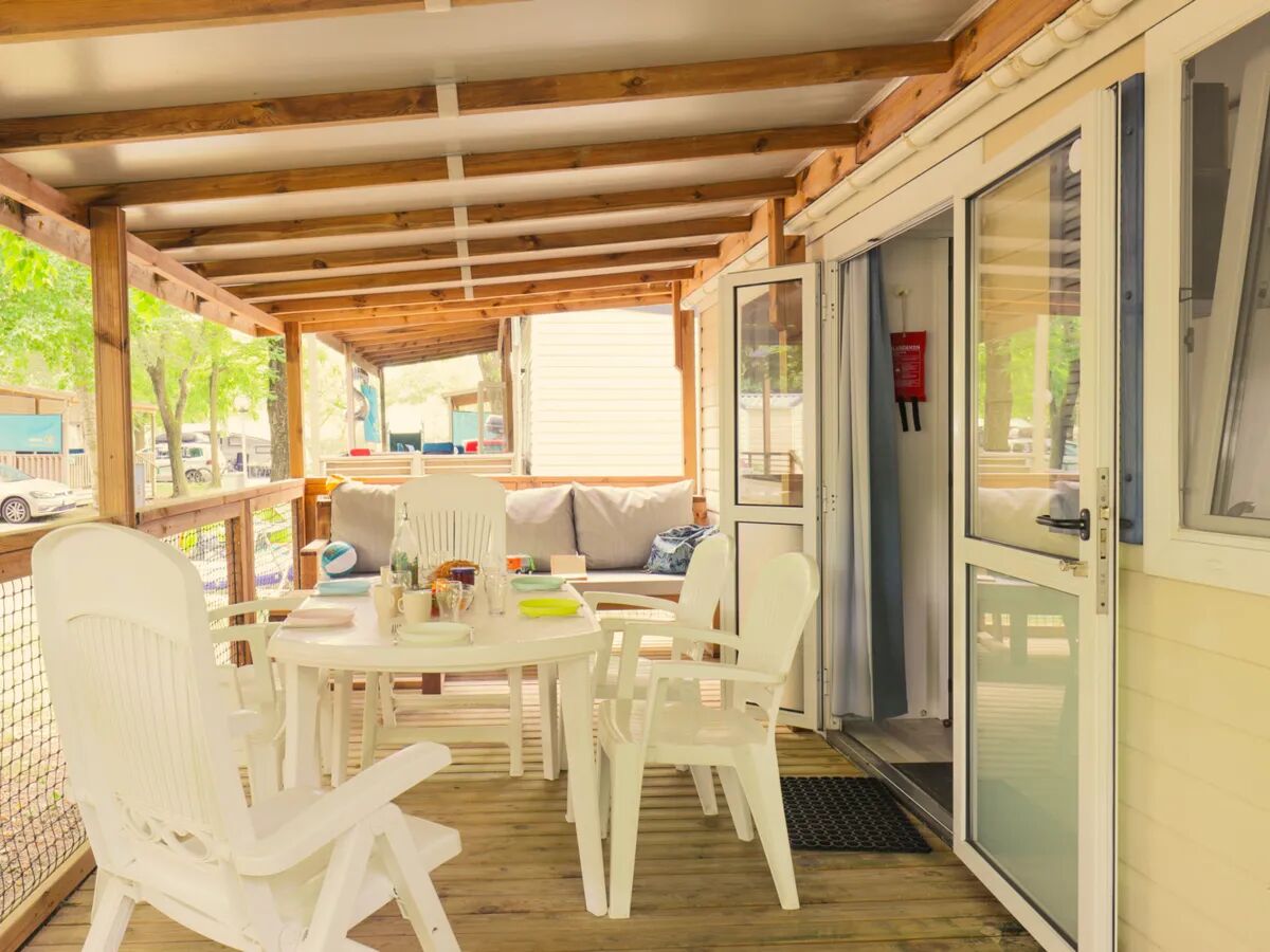 AC Zamykany taras Sofa wypoczynkowaNa wielu campingach z naszej oferty można zarezerwować wersję Relax naszego popularnego mobile home'u Classic. Ten w pełni wyposażony domek posiada klimatyzację, a na zadaszonym tarasie o powierzchni 15 m2 znajduje się sofa wypoczynkowa.