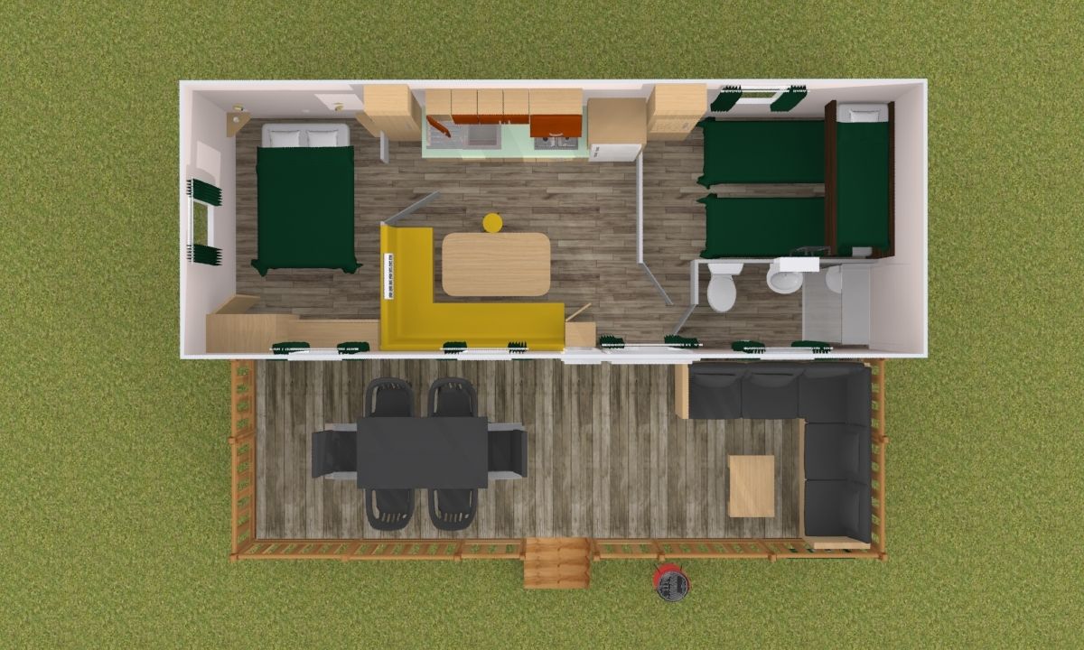 Comfort Lounge ma częściowo zadaszony, drewniany taras z luksusowym, przesuwanym parasolem , sofą lounge, 2 regulowanymi krzesłami, 4 krzesłami ogrodowymi, wygodnym leżakiem i suszarką. Na niektórych campingach taras jest całkowicie zadaszony. Na stronie danego campingu znajdziesz informację o rodzaju bezpłatnego grilla lub płyty grillowej przy zakwaterowaniu. Mobile home Comfort Lounge może pomieścić do 6 osób, jednak dla większego komfortu zalecamy pobyt maksymalnie 5 osobom.