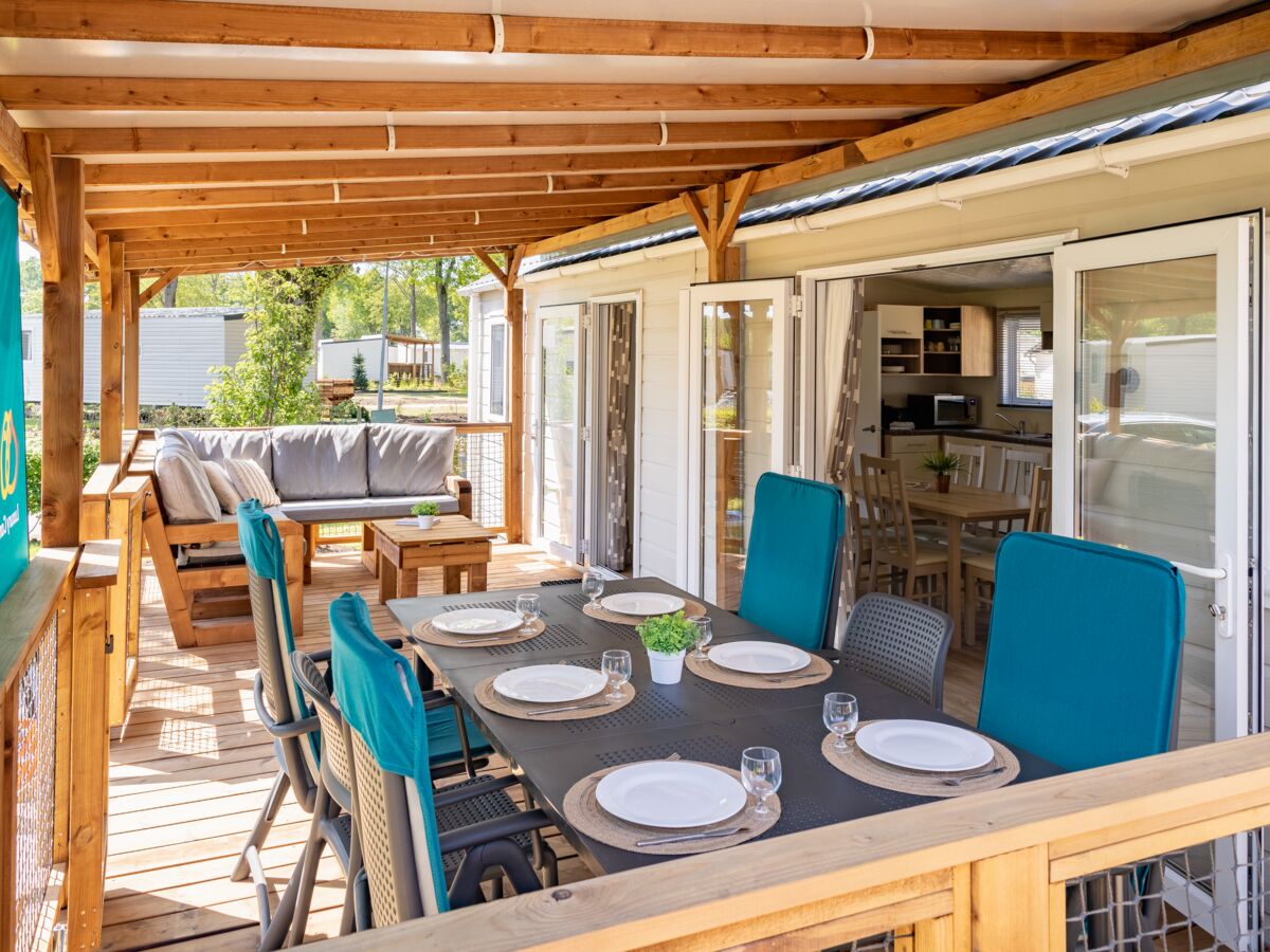 AC SAT-TV Taras Zamykany taras Sofa wypoczynkowa Zmywarka Pościel w cenie Sprzątanie końcoweNasz mobile home Comfort Lounge jest wyjątkowy ze względu na przestronny taras o powierzchni nie mniejszej niż 19 m2 z rodzinnym stołem i narożną sofą wypoczynkową. Domek wyposażony jest w 3 sypialnie. Ponadto w cenę zakwaterowania wliczona jest pościel i sprzątanie końcowe!