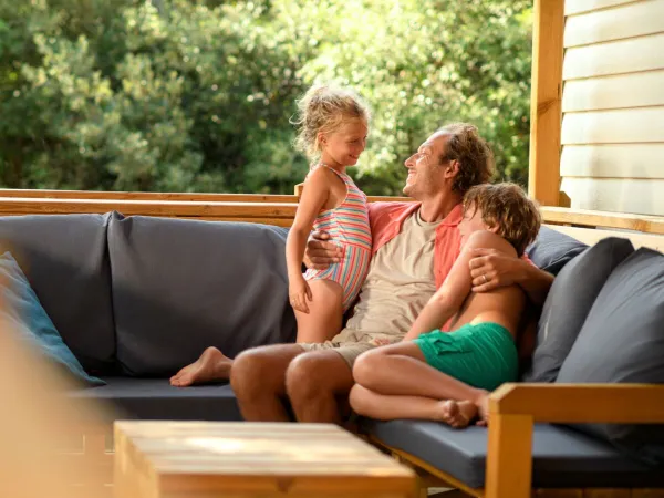 Duży drewniany taras o powierzchni 19 m2 z częścią jadalną i przestronnym salonem wyposażonym w 4 regulowane krzesła z poduszkami i rozkładany leżak. Sofa wypoczynkowa jest w komplecie z dużymi poduszkami i stolikiem kawowym. Tras jest całkowicie zadaszony lub wyposażony w osłonę przeciwsłoneczną lub przesuwany parasol. Zamykany taras jest również wyposażony w baner przeciwsłoneczny dający prywatność i chroniący przed słońcem. Na stronie danego campingu znajdziesz informację o rodzaju bezpłatnego grilla lub płyty grillowej przy zakwaterowaniu.