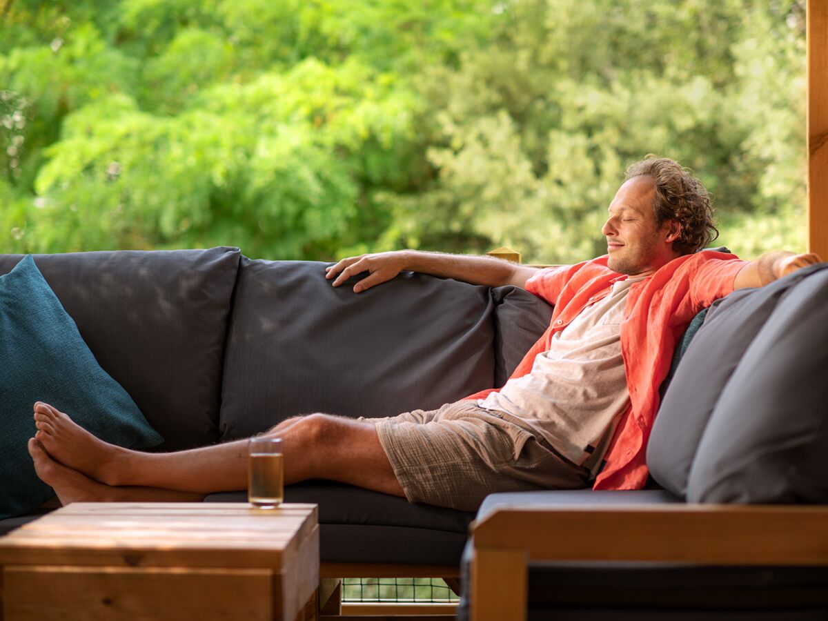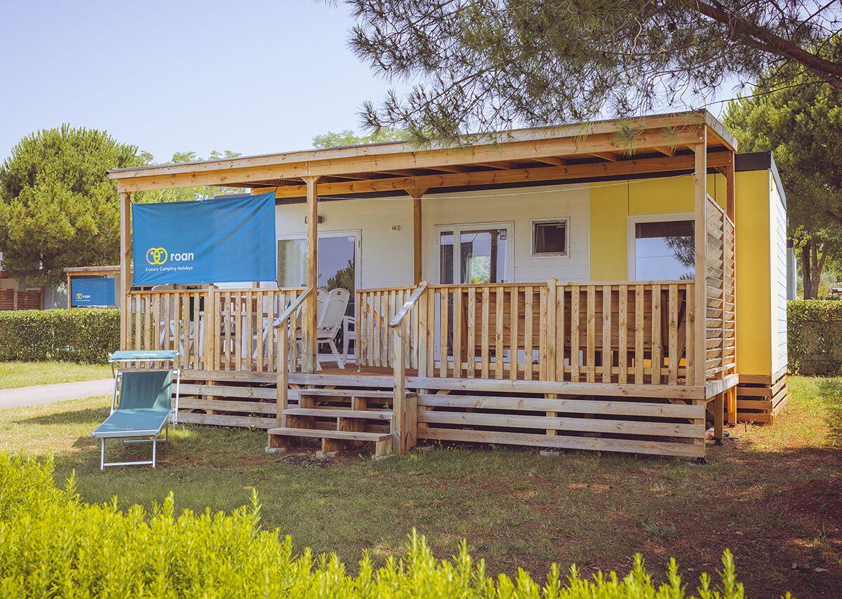 Drewniany taras ma 19 m2, jest przestronny i zapewnia dużo dodatkowego miejsca. Jest tu część jadalna z 4 regulowanymi fotelami z poduszkami oraz regulowanym leżakiem. Po drugiej stronie znajduje się wygodna sofa z poduszkami i małym stolikiem - idealne miejsce na relaks. Teraz jest całkowicie zadaszony lub wyposażony w regulowany parasol i ma zawsze zamykaną bramkę. Jest tu też dodatkowo specjalny baner przeciwsłoneczny zapewniający prywatność i cień, gdy słońce świeci mocno lub jecie posiłek. Na stronie danego campingu znajdziesz informację o rodzaju bezpłatnego grilla lub płyty grillowej przy zakwaterowaniu.