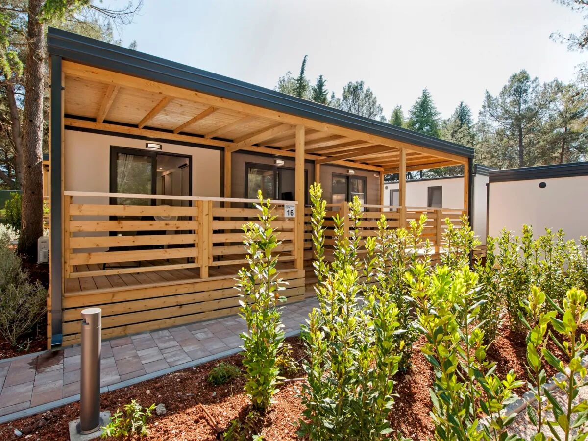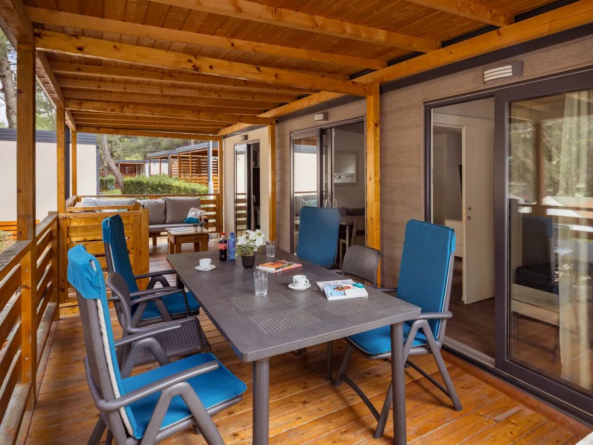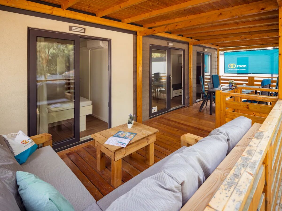 Taras domku jest zadaszony i ma powierzchnię nie mniejszą niż 24 m2. Luksusowy zestaw ogrodowy składa się z czterech regulowanych krzeseł z poduszkami i dwóch krzeseł ogrodowych. Po drugiej stronie tarasu znajduje się sofa wypoczynkowa z dużymi, wygodnymi poduszkami. Baner przeciwsłoneczny Roan zapewnia dodatkowy cień i prywatność. Na stronie danego campingu znajdziesz informację o rodzaju bezpłatnego grilla lub płyty grillowej przy zakwaterowaniu.