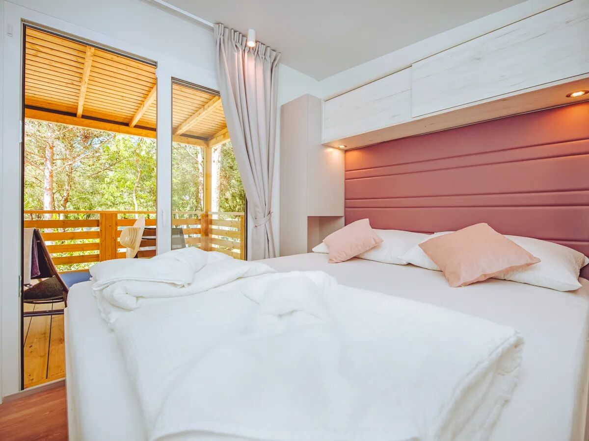 Mobile home Comfort Plus Lounge posiada 3 sypialnie: jedną z łóżkiem podwójnym i 2 sypialnie dla dzieci z 2 łóżkami pojedynczymi. Sofa w salonie również rozkłada się do spania (1,90 x 0,80). W głównej sypialni znajduje się dodatkowy klimatyzator. Ponadto każdy mobile home na wyposażeniu posiada 1 barierkę zabezpieczającą na łóżko.