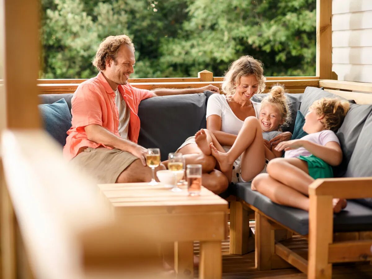 Drewniany taras jest zadaszony i ma powierzchnię nie mniejszą niż 24 m2. Luksusowy zestaw ogrodowy składa się z czterech regulowanych krzeseł z poduszkami i dwóch krzeseł ogrodowych. Po drugiej stronie tarasu znajduje się sofa wypoczynkowa z dużymi, wygodnymi poduszkami. Baner przeciwsłoneczny Roan zapewnia dodatkowy cień i prywatność. Na stronie danego campingu znajdziesz informację o rodzaju bezpłatnego grilla lub płyty grillowej przy zakwaterowaniu.