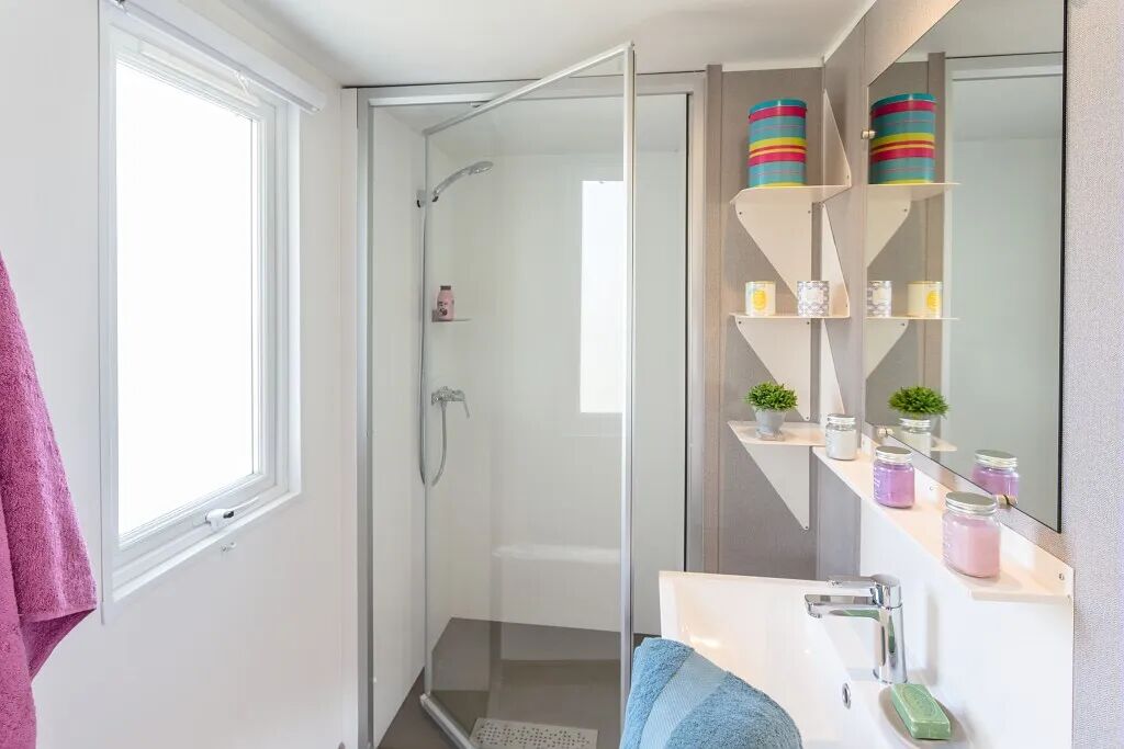 Domek mobilny Premium Compact bez TV posiada 3 sypialnie: jedną z podwójnym łóżkiem 1,60 x 1,90 m oraz dwie sypialnie z 2 łóżkami pojedynczymi. W standardzie dostępna jest barierka do łóżka, którą możesz samodzielnie zamontować, jako ochronę dla najmłodszych dzieci.