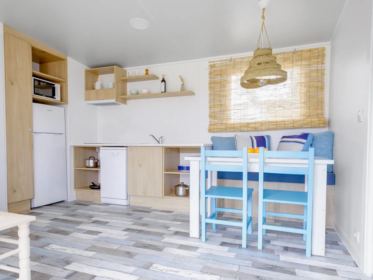 Kuchnia jest wyposażona w lodówkę z zamrażalnikiem, kuchenkę, kuchenkę mikrofalową, ekspres do kawy Nespresso, czajnik, zmywarkę oraz pełny zestaw przyborów kuchennych. W salonie znajduje się telewizor z kanałami satelitarnymi. Mobile home oferuje dodatkowy komfort dzięki dwóm łazienkom: jedna połączona jest z dużą sypialnią i zawiera umywalkę, przestronną kabinę prysznicową oraz toaletę, a druga, znajdująca się przy mniejszej sypialni, wyposażona jest w umywalkę, dużą kabinę prysznicową i toaletę.