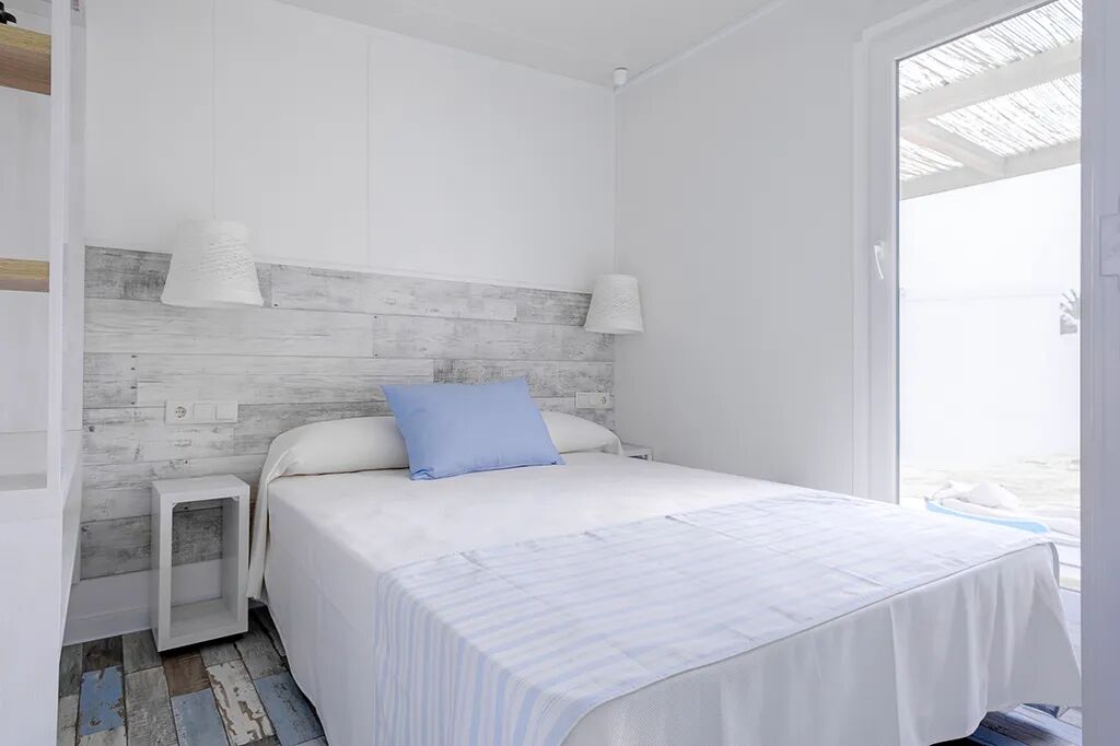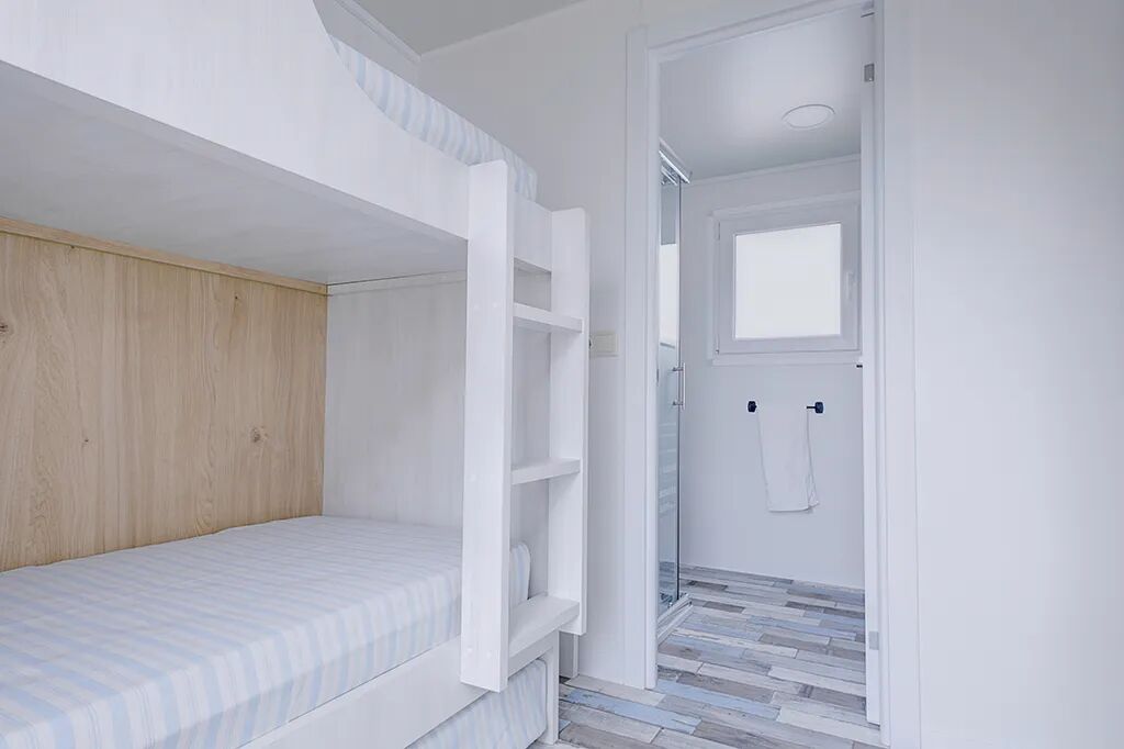 Zakwaterowanie obejmuje 2 sypialnie. W głównej sypialni znajduje się łóżko podwójne, a w drugiej łóżko piętrowe (maks. 70 kg) z dodatkowym łóżkiem wysuwanym. Każdy mobile home standardowo posiada 1 barierkę do łóżka.