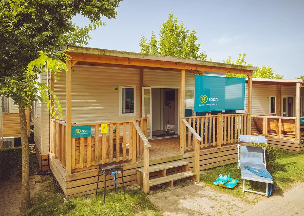 Taras o długości nie mniej niż 7,5 m i 2,5 m szerokości jest otoczony barierką z bramą, którą można zamknąć. Taras jest częściowo zadaszony, dzięki czemu można cieszyć się posiłkami na zewnątrz bez względu na pogodę. Wszystkie mobile home’y Premium Relax mają specjalny baner przeciwsłoneczny, który zapewnia cień przy mocno świecącym słońcu. Druga strona tarasu jest wyposażona w wygodną sofę z dużymi poduszkami, stolik kawowy i przesuwany parasol lub drewniany dach. Luksusowy komplet mebli składa się z czterech regulowanych krzeseł, trzech krzeseł ogrodowych i leżaka z baldachimem. Na stronie danego campingu znajdziesz informację o rodzaju bezpłatnego grilla lub płyty grillowej przy zakwaterowaniu.