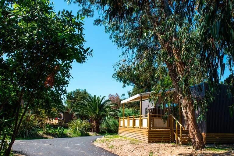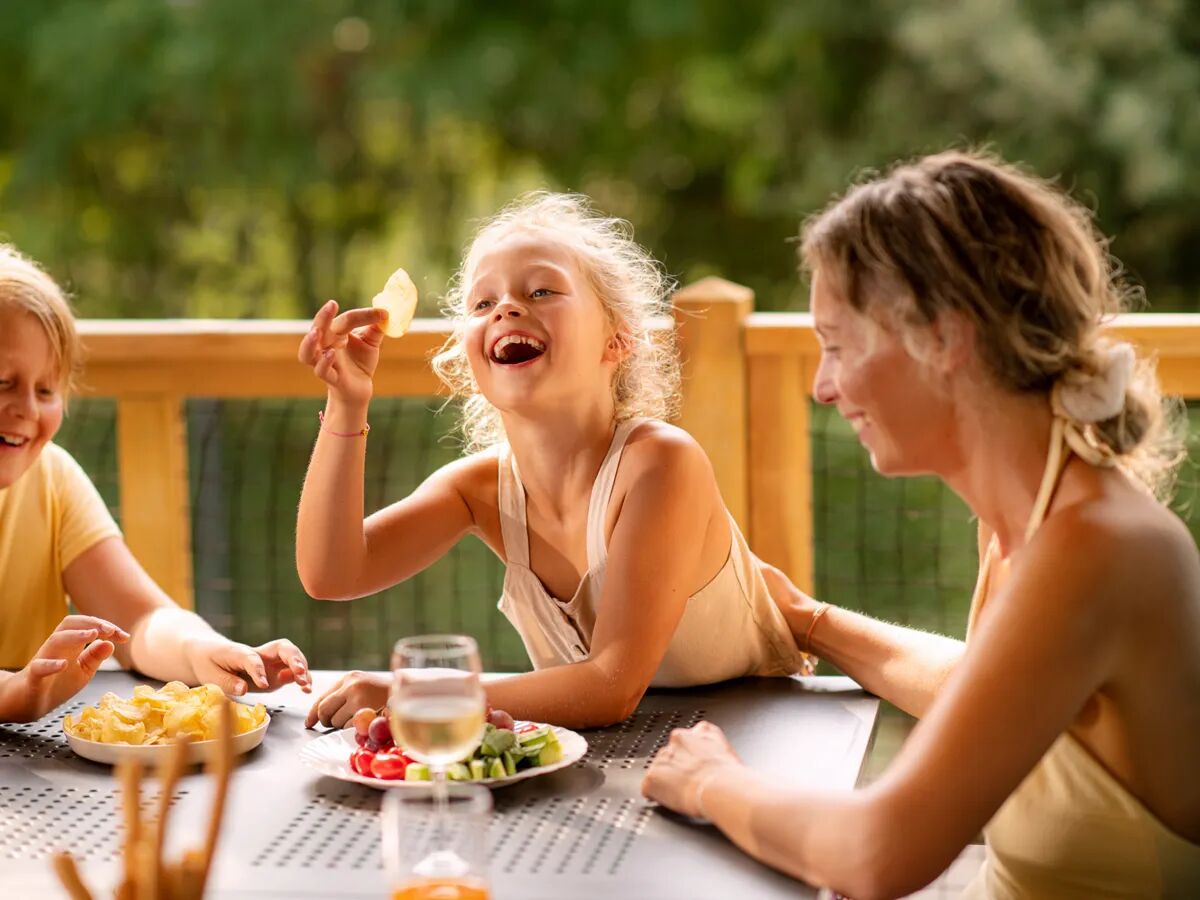 Częściowo zadaszony teras ma powierzchnię nie mniejszą niż 15 m2 i wyposażony jest w zestaw ogrodowy. Składa się on z 4 regulowanych krzeseł, 2 foteli i 2 wygodnych leżaków. Na stronie danego campingu znajdziesz informację o rodzaju grilla przy zakwaterowaniu.
