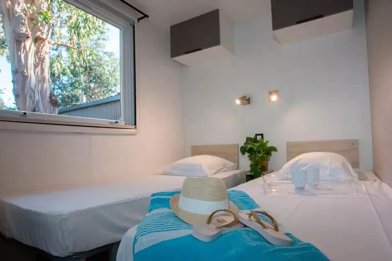 Ten mobile home posiada 3 sypialnie zapewniające maksymalny komfort snu! W głównej sypialni znajduje się duże podwójne łóżko o wymiarach 1,60 x 2,00 m. W drugiej i trzeciej sypialni znajdują się 2 łóżka pojedyncze. Dostępna jest także barierka do łóżka, którą można wsunąć pod materac. W salonie, w razie potrzeby, jedna osoba może spać na sofie.